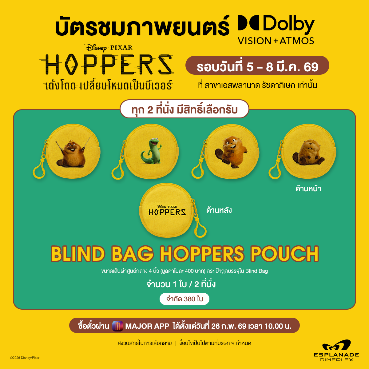 • ซื้อตั๋วชมภาพยนตร์ Hoppers เฉพาะระบบ DVA วันที่ 5 – 8 มี.ค. 69 ทุก 2 ที่นั่ง มีสิทธิ์เลือกรับ Blind bag pouch ได้ฟรีจำนวน 1 ใบ
