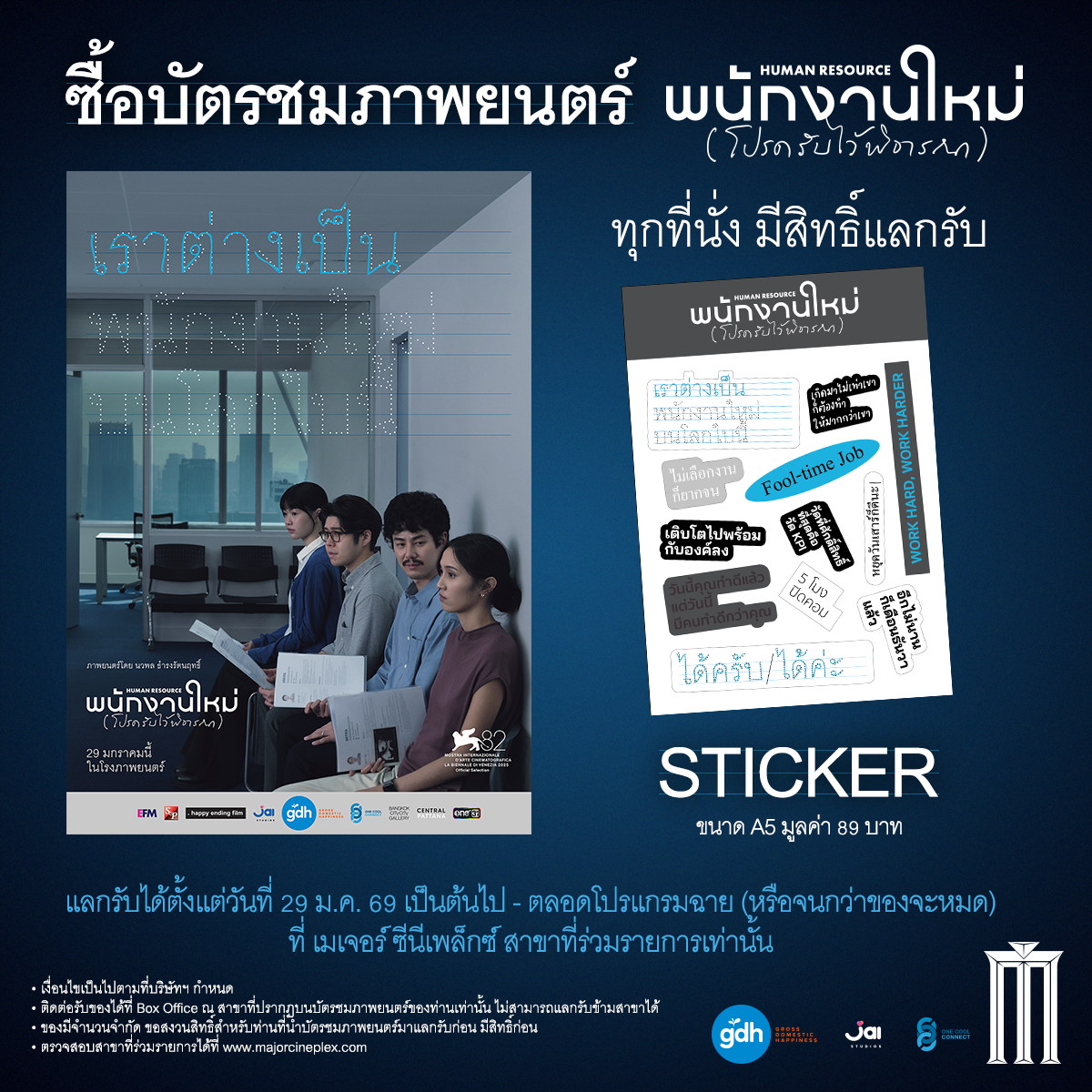 • ซื้อบัตรชมภาพยนตร์ เรื่อง “พนักงานใหม่ (โปรดรับไว้พิจารณา)” ทุก 1 ที่นั่ง แลกรับ Sticker ขนาด A5 มูลค่า 89 บาท จำนวน 1 ชิ้น