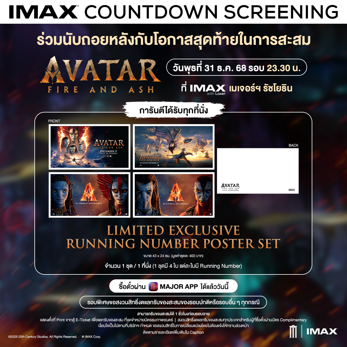 •  ซื้อตั๋วชมภาพยนตร์ Avatar Fire and ash ระบบ IMAX วันที่ 31 ธ.ค. 68 เวลา 23.30 น. เท่านั้น ทุก 1 ที่นั่ง สามารถแลกรับ Limited Exclusive running number poster set จำนวน 1 เซ็ต (1 เซ็ตมี 4 ใบ แต่ละใบมี running number / ขนาด 43 x 24 ซม.)