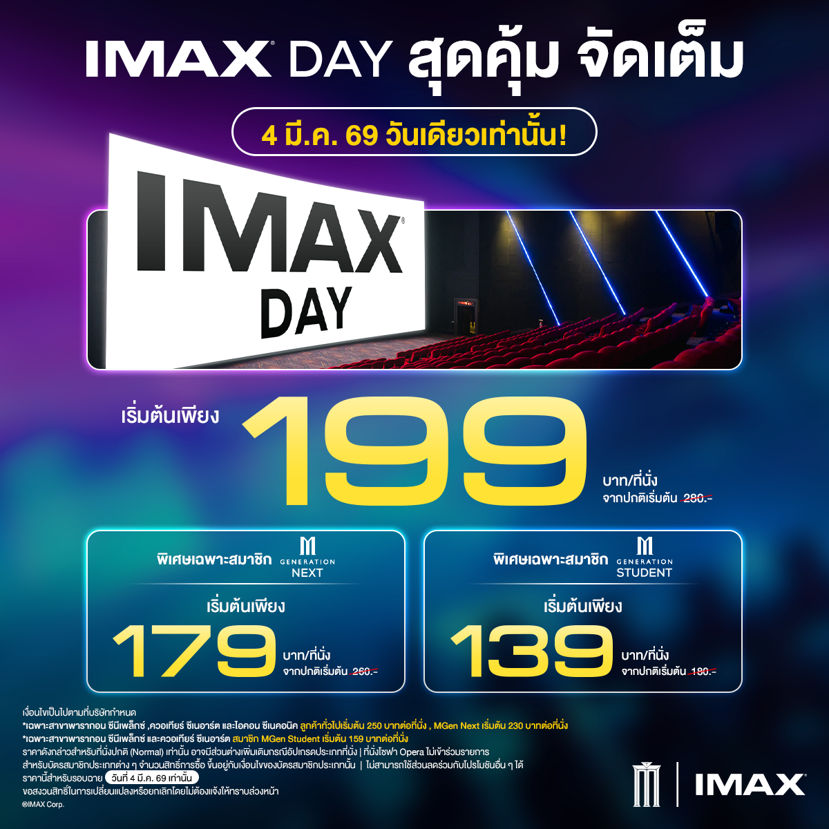 • เฉพาะสาขาพารากอน ซีนีเพล็กซ์ และ ควอเทียร์ ซีเนอาร์ต สมาชิก MGen Student เริ่มต้น 159 บาทต่อนั่ง