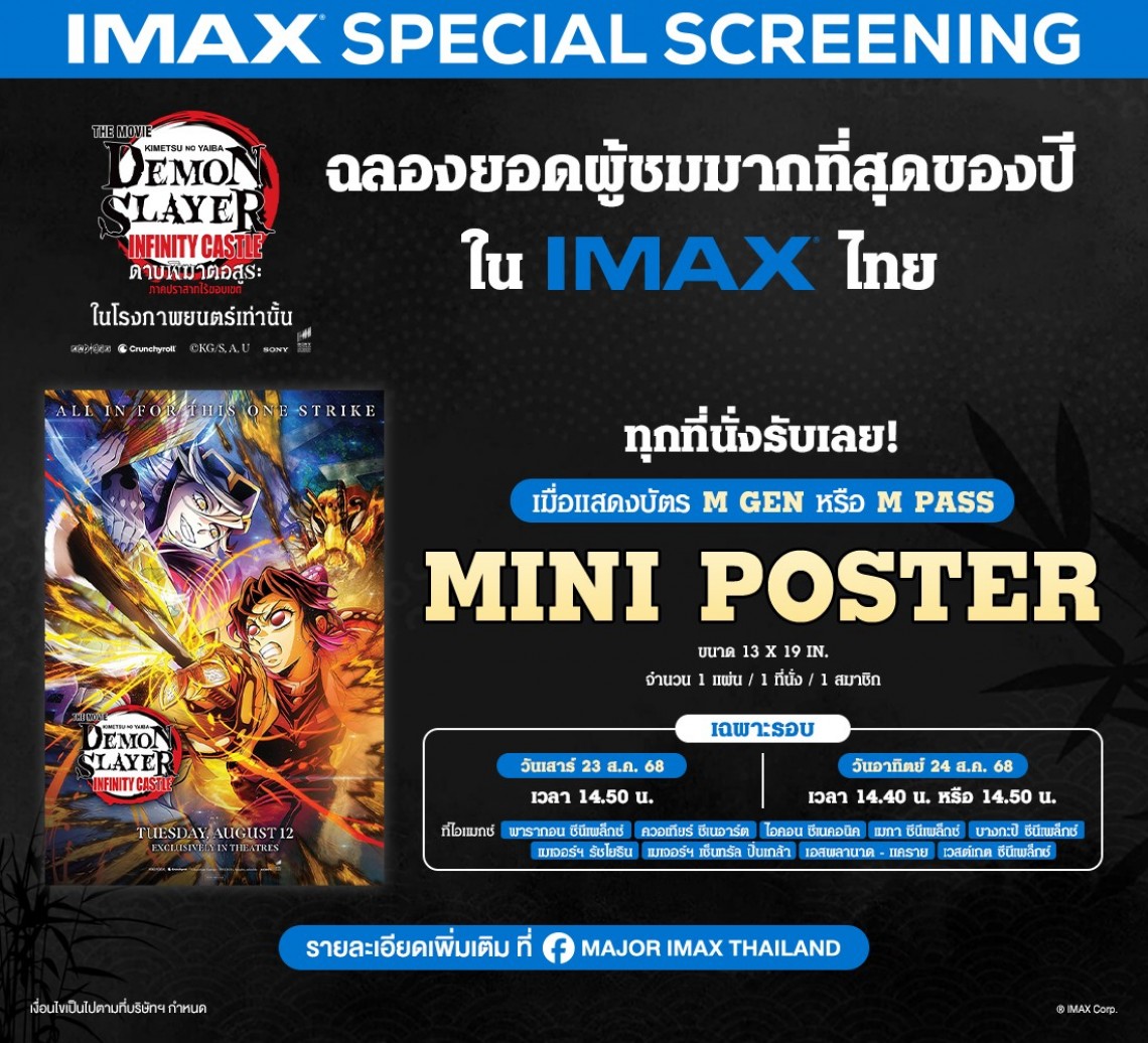 • สำหรับลูกค้าที่ซื้อบัตรชมภาพยนตร์ระบบ IMAX with Laser หรือ IMAX เรื่อง Demon Slayer Infinity Castle พร้อมแสดงบัตร M Gen หรือ M Pass มีสิทธิ์แลกรับ Mini Poster จำนวน 1 ใบต่อ 1 ที่นั่ง