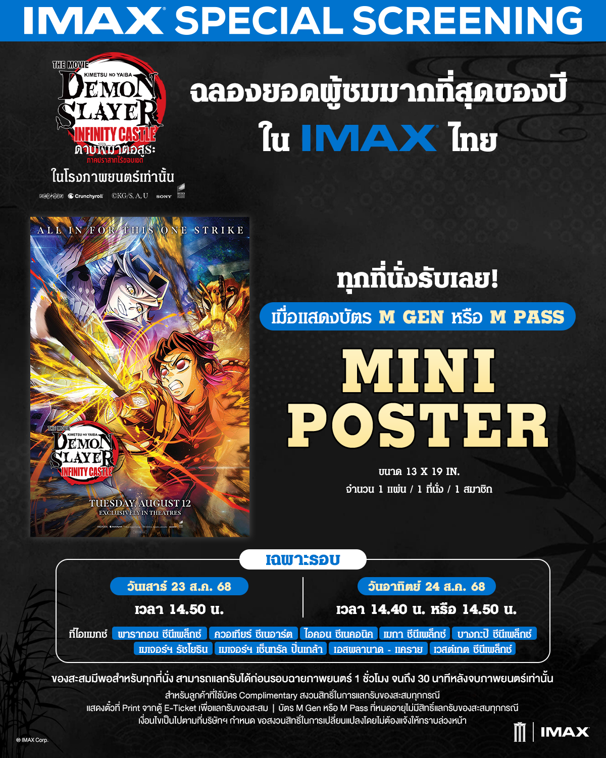 • สำหรับลูกค้าที่ซื้อบัตรชมภาพยนตร์ระบบ IMAX with Laser หรือ IMAX เรื่อง Demon Slayer Infinity Castle พร้อมแสดงบัตร M Gen หรือ M Pass มีสิทธิ์แลกรับ Mini Poster จำนวน 1 ใบต่อ 1 ที่นั่ง