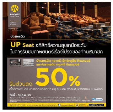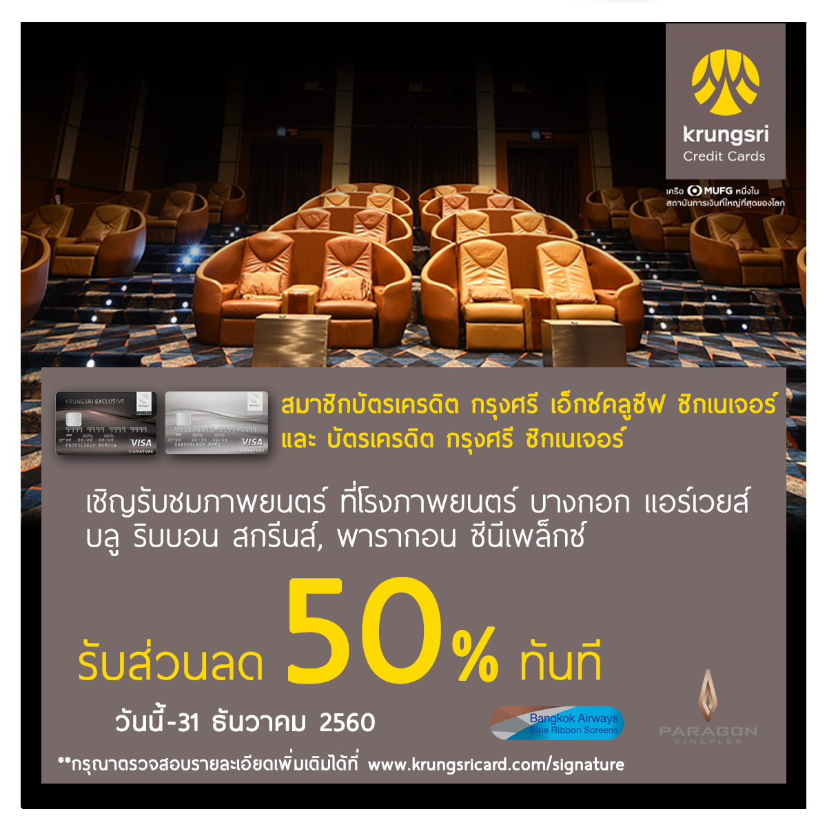 อภิสิทธิ์ความสุขเหนือระดับ สำหรับสมาชิกบัตรเครดิต กรุงศรี เอ็กซ์คลูซีฟ ซิกเนเจอร์ และบัตรเครดิต กรุงศรี ซิกเนเจอร์ รับส่วนลด 50% สำหรับซื้อบัตรชมภาพยนตร์โรง Bangkok Airways Blue Ribbon Screen @ Paragon Cineplex