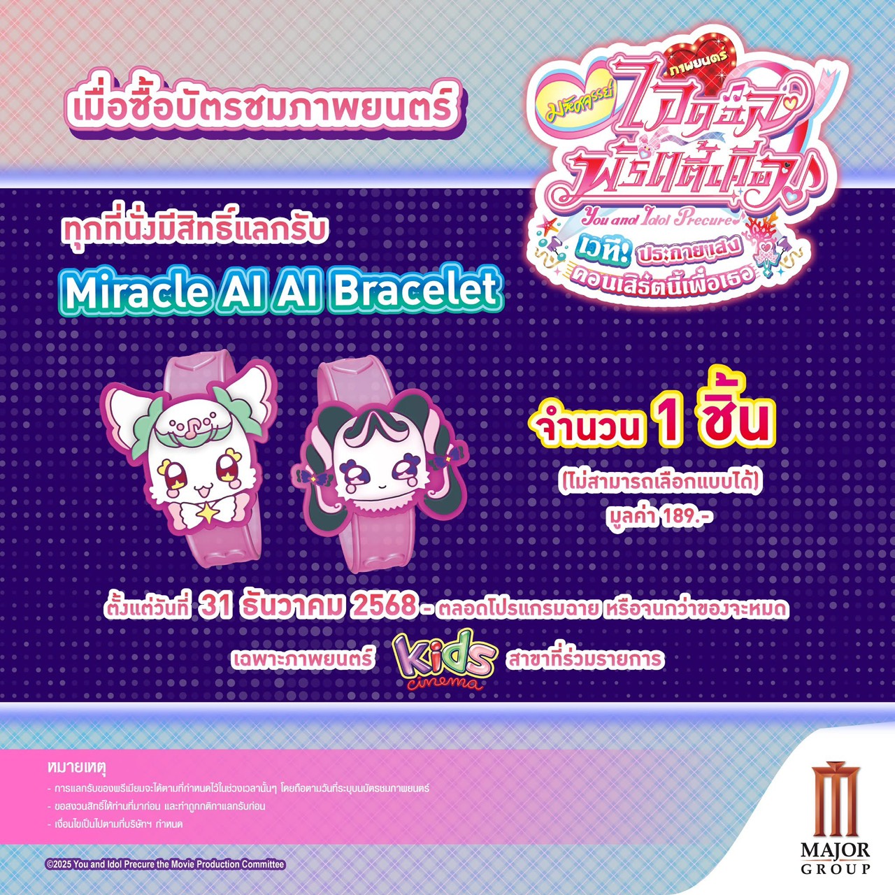 ซื้อบัตรชมภาพยนตร์เรื่อง Kimi to Idol Pretty Cure Omatase Kimi ni Todokeru ทุก 1 ที่นั่ง รับ Miracle AI AI Bracelet 1 ชิ้น (แบบสุ่มจาก 2 แบบ) มูลค่า 189 บาท