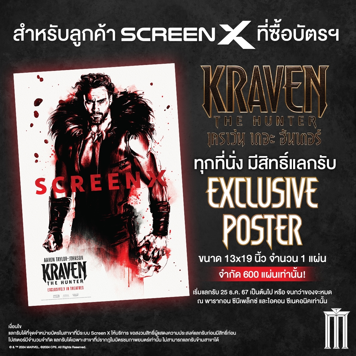 • ซื้อตั๋วชมภาพยนตร์ “KRAVEN THE HUNTER” เฉพาะระบบ SCREEN X ทุก 1 ที่นั่ง สามารถแลกรับ SCREEN X Exclusive Poster ได้ฟรี จำนวน 1 แผ่น
