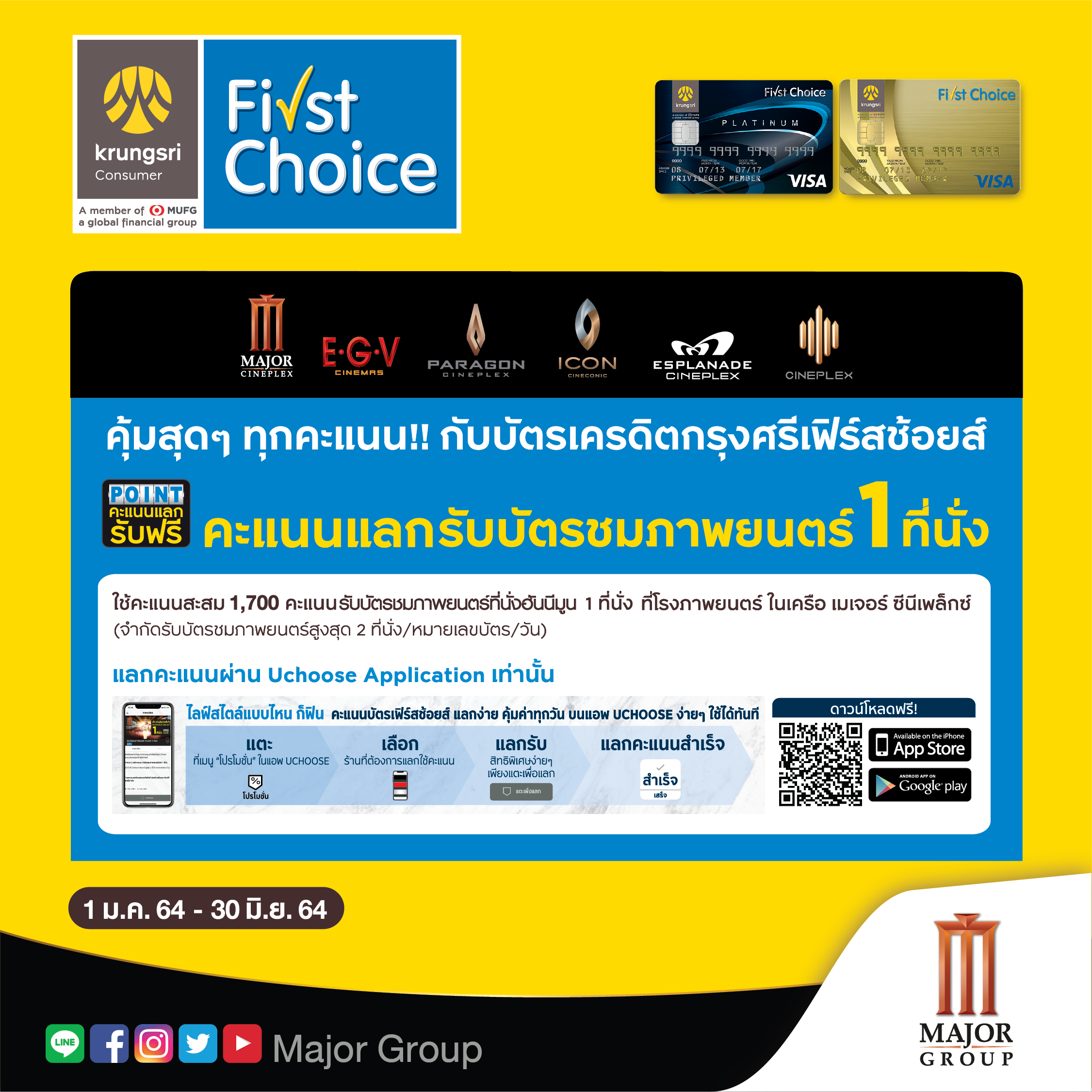 รายละเอียด : ลูกค้าบัตร Krungsri First ChoiceBurn Point1,700 Point แลกรับบัตรชมภาพยนตร์จำนวน 1 ที่นั่ง (ที่นั่งฮันนีมูน)