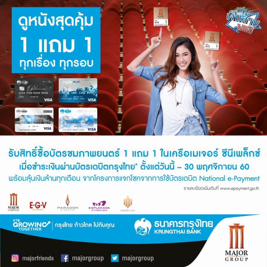 ลูกค้าที่ซื้อบัตรชมภาพยนต์ ผ่าน บัตรเดบิต กรุงไทย วีซ่า ทุกประเภท สามารถรับสิทธิซื้อบัตรชมภาพยนตร์ 1 ที่นั่ง ฟรี 1 ที่นั่ง (1บัตร/สิทธิ์/ เดือน) ได้ที่ Box Office จำกัดจำนวนสิทธิ์ 1,000 สิทธิ์/เดือน รวม 6,000 สิทธ์ตลอดโครงการ