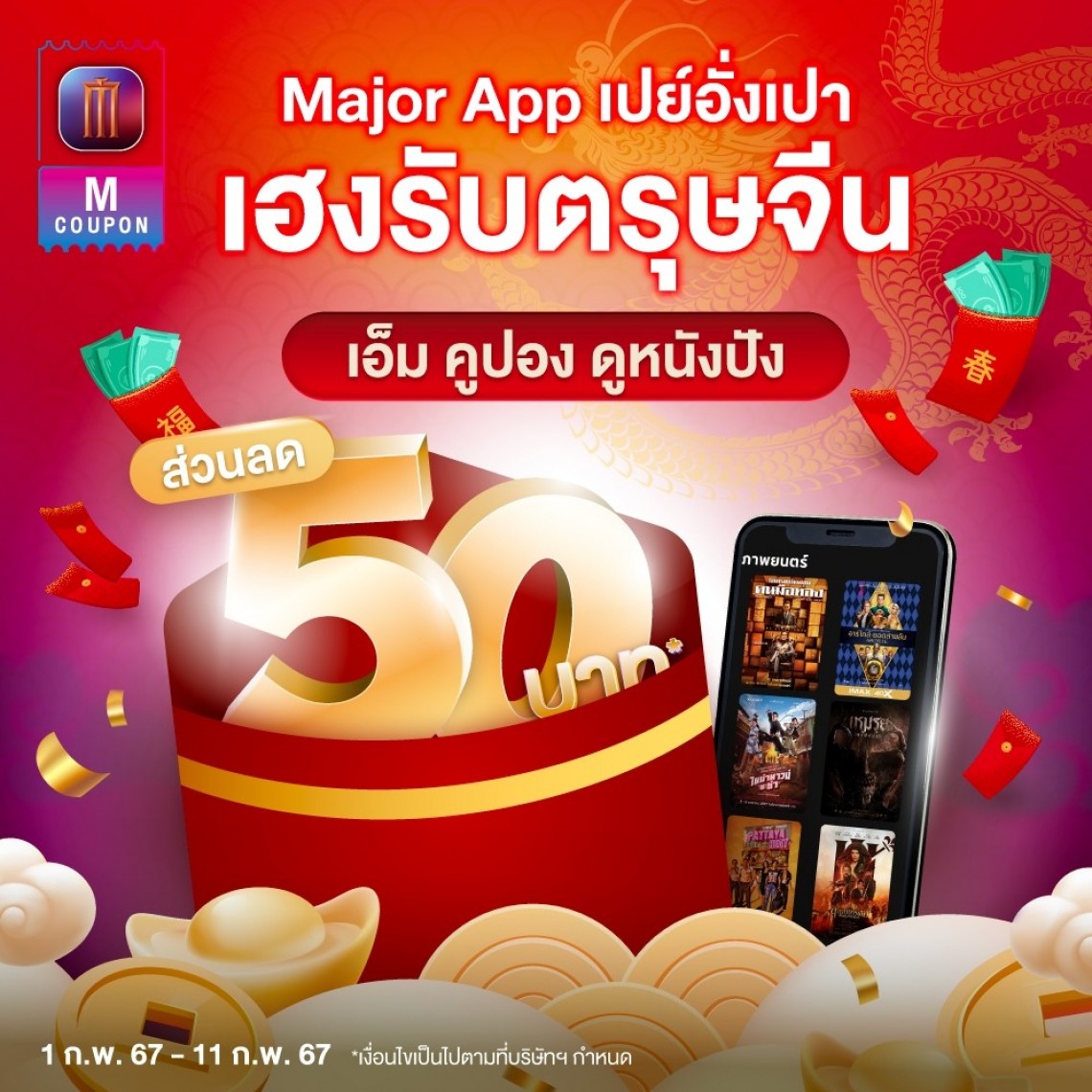 ตรุษจีนนี้ Major App มีเปย์! ดูหนังสุดปัง กับอั่งเปาส่วนลด ไว้ดูหนังสุดคุ้ม ด้วย “เอ็ม คูปอง ส่วนลด 50 บาท” พิเศษเฉพาะ Major App !*