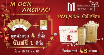 M GEN Angpao สมาชิก M GEN รับสิทธิ์ชมภาพยนตร์ ฟรี 1 ที่นั่ง เมื่อชมภาพยนตร์ครบ 4 ที่นั่ง พร้อมใช้คะแนนพิเศษแลกรับของรางวัล ต้อนรับตุรษจีน