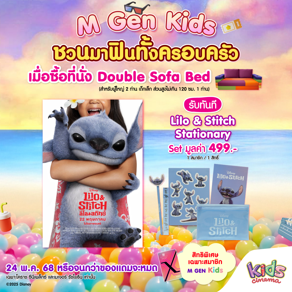 M Gen Kids ชวนมาฟินทั้งครอบครัว เมื่อซื้อที่นั่ง Double Sofa Bed (สำหรับผู้ใหญ่ 2 ท่าน และเด็กเล็กส่วนสูงไม่เกิน 120 เซนติเมตร 1 ท่าน) รับชมภาพยนตร์เรื่อง Lilo & Stitch รับทันที Lilo & Stitch Stationary Set มูลค่า 499.-