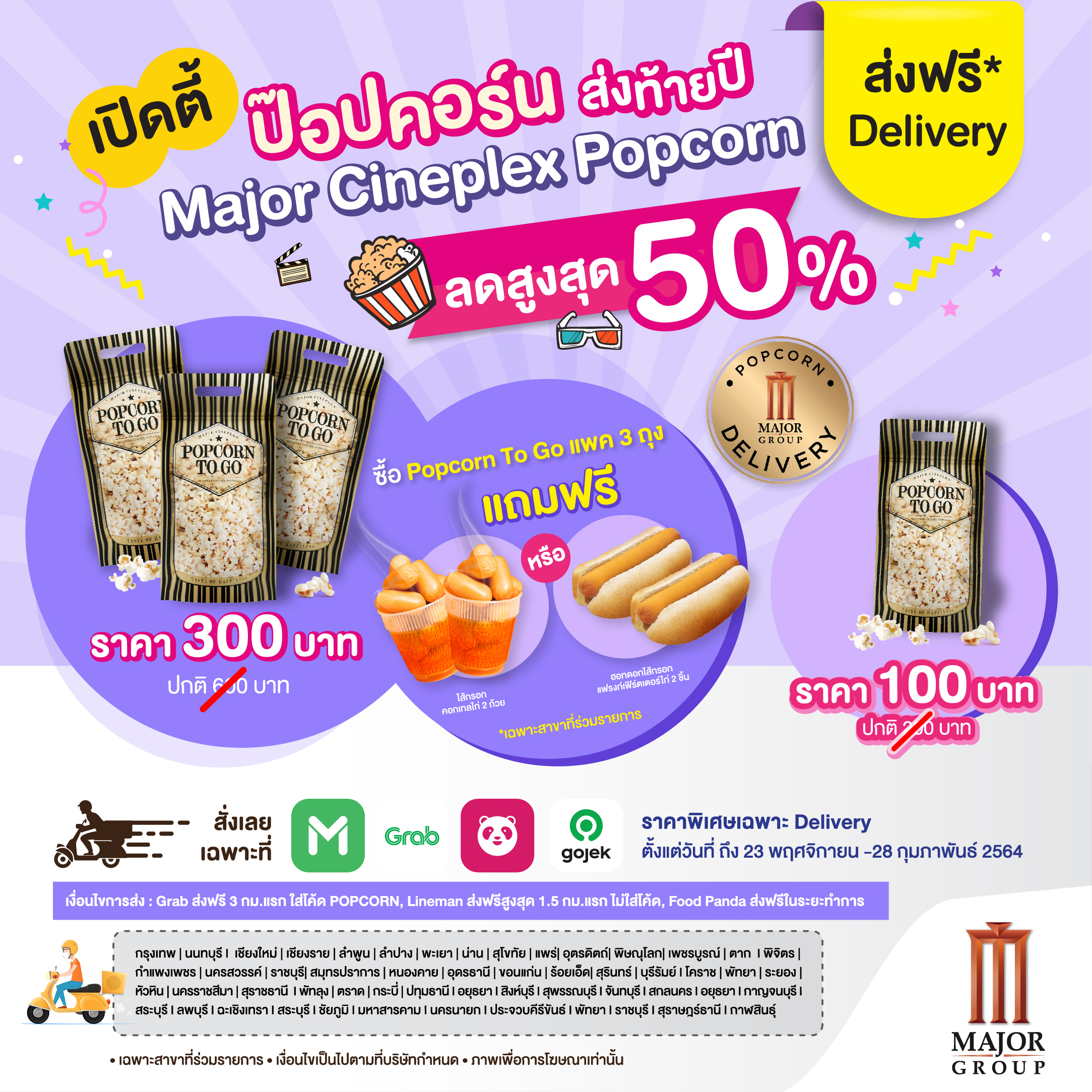 Major Cineplex Popcorn ลดสูงสุด 50% 1. POPCORN TO GO ZIP LOCK 75 OZ. จำนวน 1 ถุง ราคาพิเศษ 100.- (จากปกติ 200.-) 2. POPCORN TO GO ZIP LOCK 75 OZ. จำนวน 3 ถุง ราคาพิเศษ 300.- (จากปกติ 600.-) แถมฟรี ไส้กรอก 2 ถ้วย (เฉพาะสาขาที่จำหน่ายไส้กรอก) หรือ แถมฟรี ฮอทดอกไส้กรอกแฟรงก์เฟิร์ตเตอร์ไก่ 75 กรัม 2 ชิ้น (เฉพาะสาขาที่จำหน่ายฮอทดอก) ระยะเวลา : 23 พฤศจิกายน 63 – 28 กุมภาพันธ์ 64 ราคาพิเศษเฉพาะ Delivery เท่นนั้น ผ่านช่องทาง Grab Food >>> https://bit.ly/36CJC1p Lineman >>> https://lineman.onelink.me/1N3T/4b1d1f87 Food Panda >>> https://www.foodpanda.co.th/th/chain/ca3cb/popcorn-major Gojek >>> bit.ly/33ydnhC เงื่อนไขการส่งฟรี Lineman ส่งฟรี 1.5 กม. แรก (ไม่ใส่โค้ด) , Grab Food ส่งฟรี 3 กม. แรก (ใส่โค้ด POPCORN) , Food Panda ส่งฟรีในระยะทำการ
