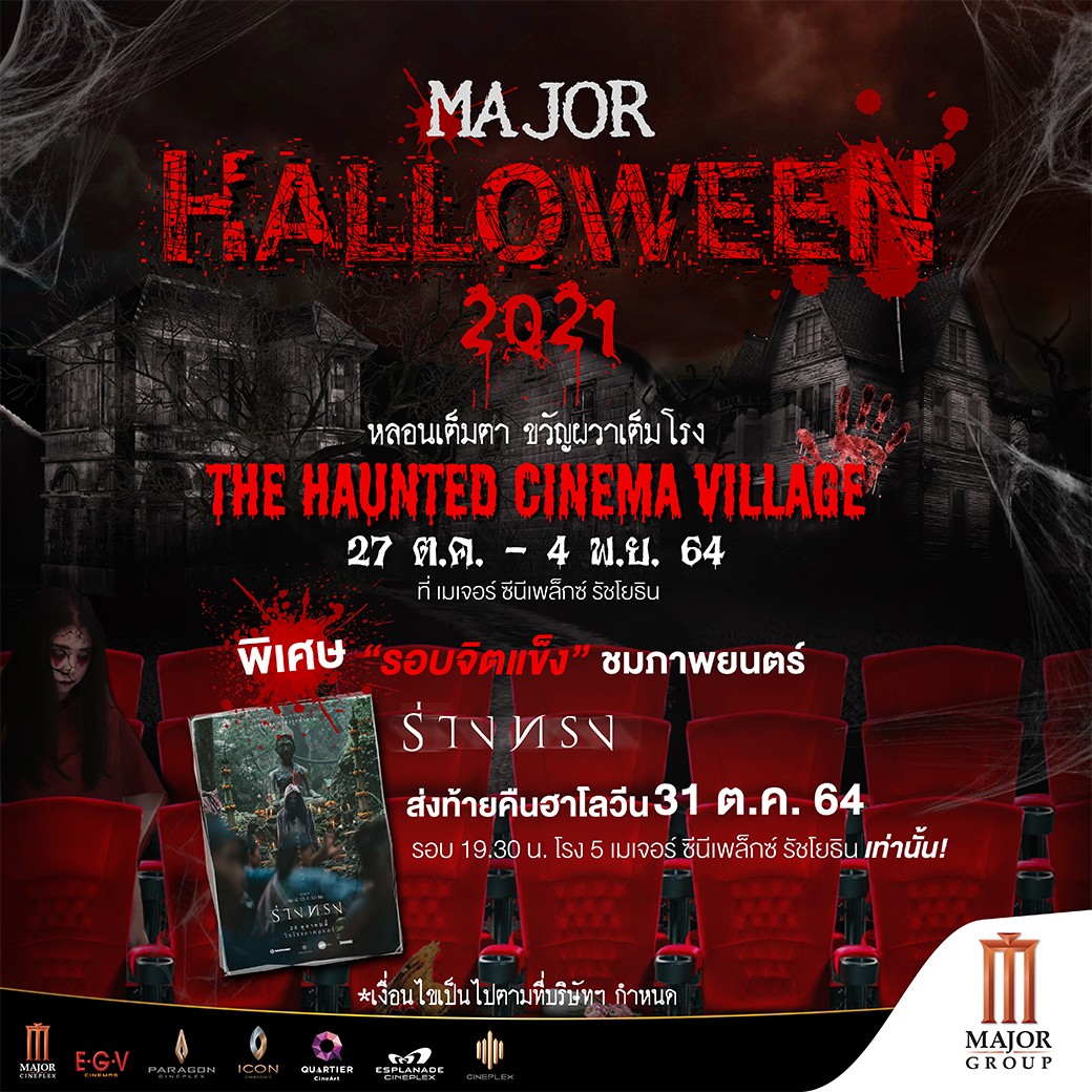 - ภาพยนตร์หลอน ต้อนรับ ฮาโลวีน ที่เข้าฉายในช่วงวันที่ 25 – 31 ตุลาคม 2564 ได้แก่ ภาพยนตร์เรื่อง ร่างทรง, The Unholy: เทวาอาถรรพณ์, The Night Beyond the Tricornered Window: คู่หูสามเหลี่ยมล่าปีศาจ, Suicide Forrest Village ป่า..ผีดุ, Malignant: ชั่วโคตรร้าย, The Conjuring the Devil Made Me Do it คนเรียกผี 3