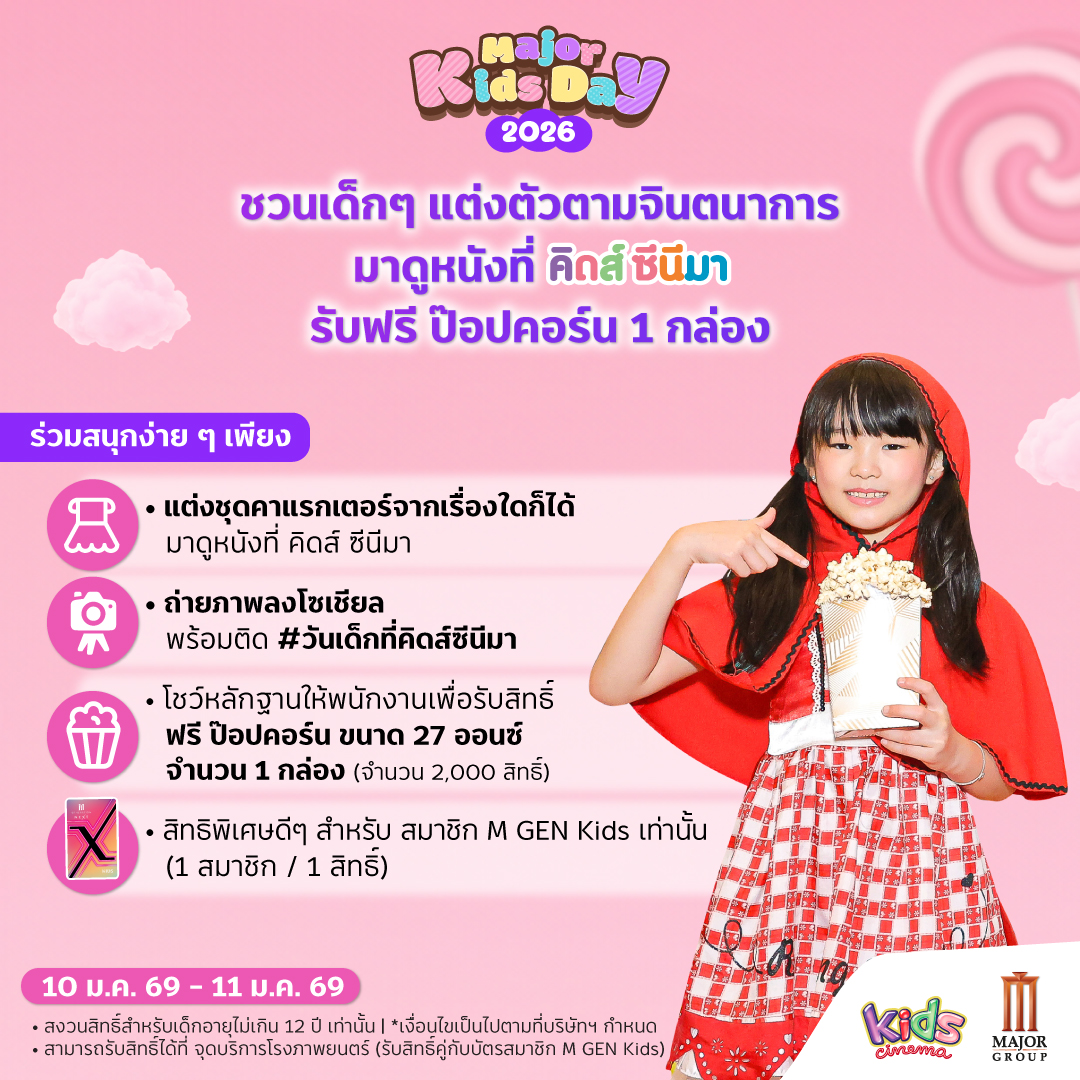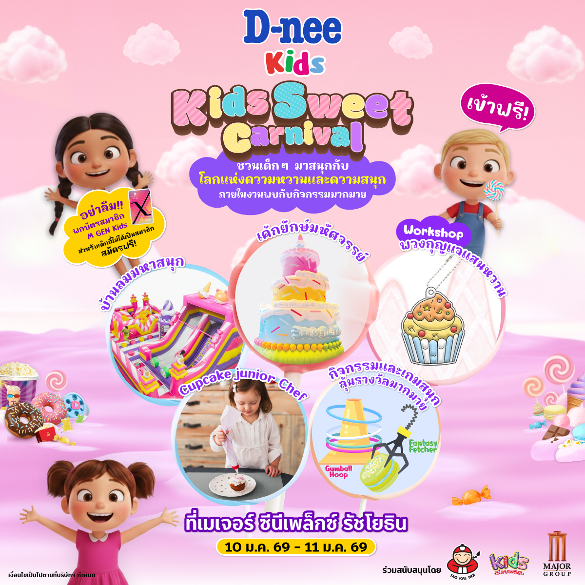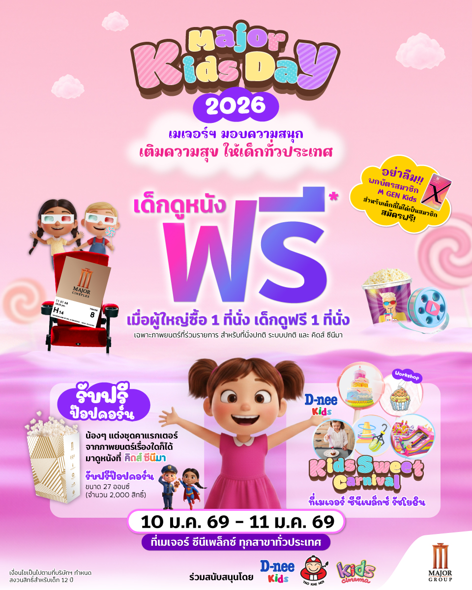 เมเจอร์ ซีนีเพล็กซ์ ร่วมกับ ผลิตภัณฑ์ D-Nee และ เถ้าแก่น้อย ร่วมจัดกิจกรรมมอบความสุขให้กับเด็กๆ กับงาน “Major Kids Day 2026 ภายใต้คอนเซปท์ Kids Sweet Carnival ชวนสนุกไปกับโลกแห่งความหวานและความสนุกสำหรับทุกครอบครัว วันที่ 10 มกราคม 2569 – 11 มกราคม 2569 ที่เมเจอร์ ซีนีเพล็กซ์ รัชโยธิน ภายในงานพบกับกิจกรรมแสนสนุก พร้อมของรางวัลมากมาย กิจกรรมเข้าฟรีตลอดงาน (พิเศษสมาชิก M GEN Kids ลงทะเบียน 200 คนแรก / วัน รับ Kids Gift Set สุดพิเศษจาก Kids Cinema)