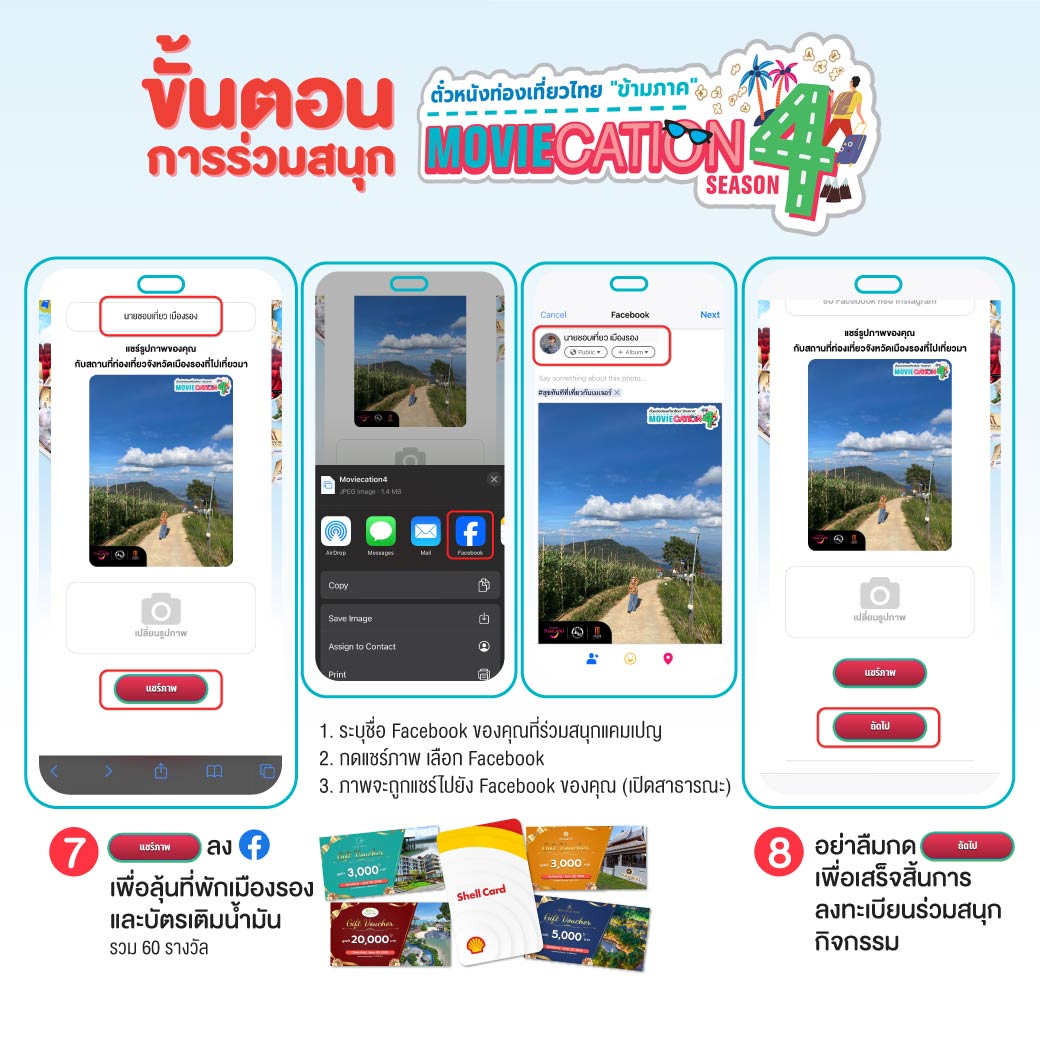 แชร์ภาพของคุณกับสถานที่ท่องเที่ยวในจังหวัดเมืองรองที่ไปเที่ยว ไปยัง Facebook ของตัวเอง ตั้งค่าเป็นสาธารณะ พร้อมติดแฮชแทค #สุขทันทีที่เที่ยวกับเมเจอร์ #Moviecation4 เพื่อลุ้นเที่ยวฟรีตามรอยหนังจังหวัดเมืองรอง จำนวน 60 รางวัล