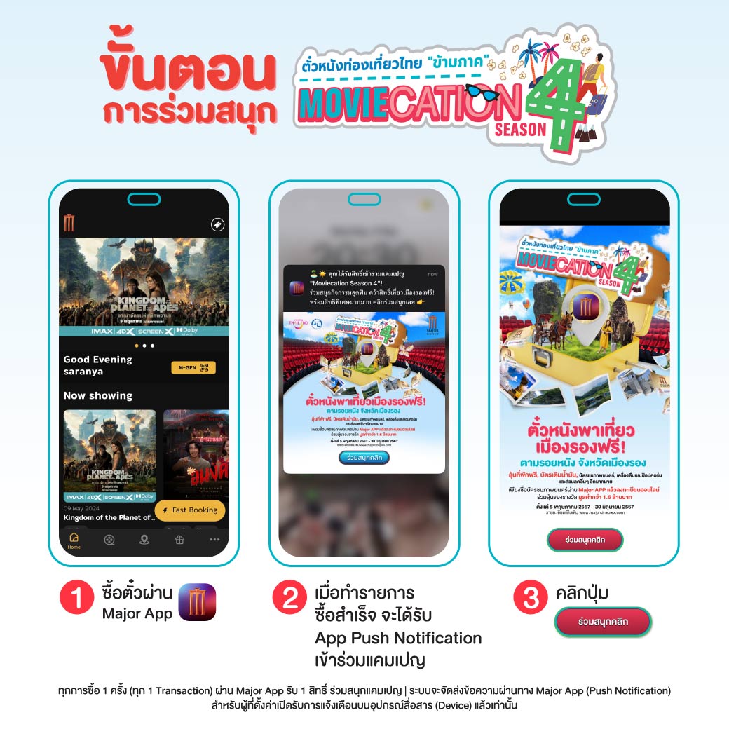• ผู้ที่ทำตามเงื่อนไขข้างต้นครบถ้วน จะได้รับข้อความผ่านทาง Major App (Push Notification) เพื่อลงทะเบียนร่วมสนุกแคมเปญ Moviecation Season 4 ตั๋วหนังท่องเที่ยวไทย “ข้ามภาค”