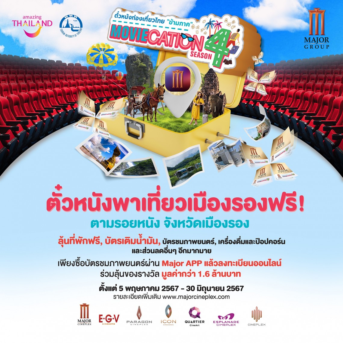 เมเจอร์ ซีนีเพล็กซ์ กรุ้ป ผนึก ททท. ชวนตามรอยหนัง เที่ยวเมืองรอง กับแคมเปญ MOVIECATION SEASON 4 ตั๋วหนังท่องเที่ยวไทย “ข้ามภาค” ลุ้นรางวัลรวมมูลค่ากว่า 1.6 ล้าน