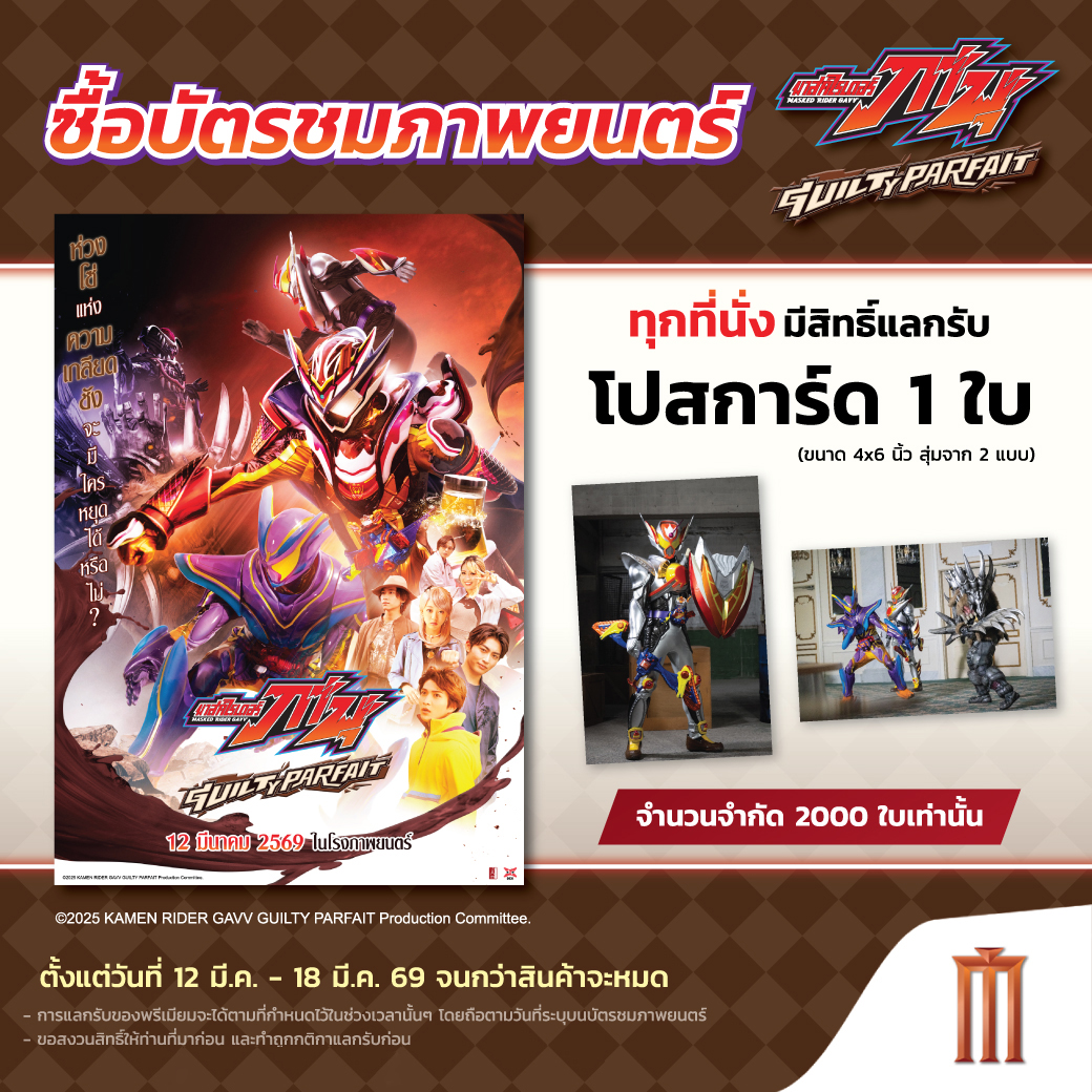 • ซื้อบัตรชมภาพยนตร์ MASKED RIDER GAVV GUILTY PARFAIT ทุกที่นั่ง มีสิทธิ์รับ โปสการ์ด จำนวน 1 ใบ (แบบสุ่มจาก 2 แบบ)