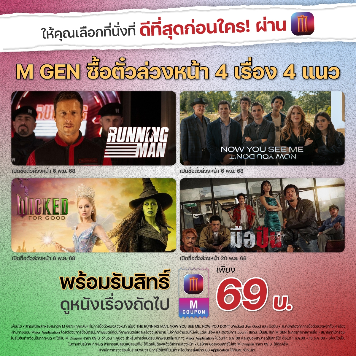 •โปรโมชั่นสำหรับสมาชิก M GEN ที่มีสถานะ Active ซื้อตั๋วล่วงหน้าภาพยนตร์ 4 เรื่องดังนี้ The Running Man, Now You See Me : Now You Don’t, The Wicked for Good และ มือปืน ที่ Major App