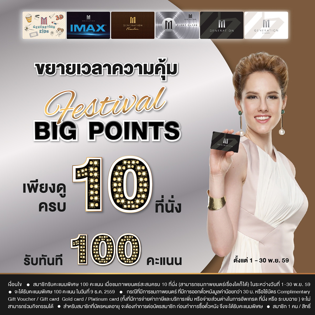 ● สมาชิก สามารถชมภาพยนตร์เรื่องใด ก็ได้ ครบ 10 ที่นั่ง ในระหว่างวันที่ 1 -30 พฤศจิกายน 2559 จึงจะได้รับคะแนนพิเศษ 100 คะแนน โดยคะแนนพิเศษจะเข้าในระบบวันที่ 9 ธันวาคม 2559