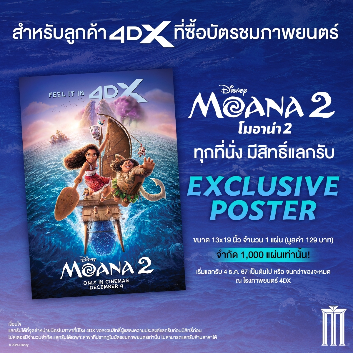 • ซื้อตั๋วชมภาพยนตร์ “Moana 2” เฉพาะระบบ 4DX ทุก 1 ที่นั่ง สามารถแลกรับ 4DX Exclusive Poster ได้ฟรี จำนวน 1 แผ่น