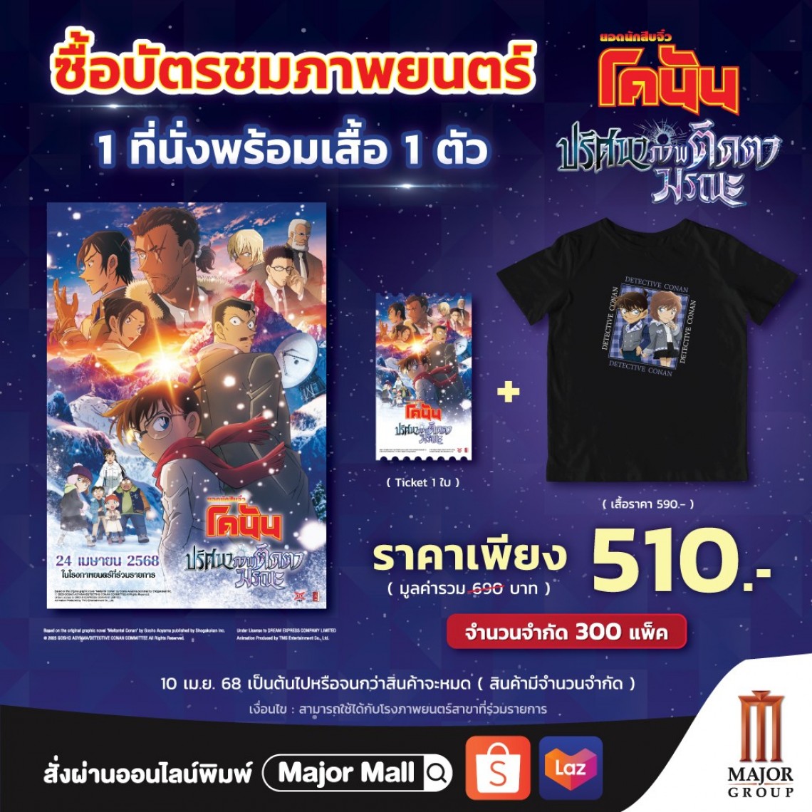 • บัตรนี้ใช้ชมภาพยนตร์เรื่อง “ยอดนักสืบจิ๋วโคนัน ปริศนาภาพติดตามรณะ” จำนวน 1 ที่นั่ง ตั้งแต่วันที่ 24 เมษายน 2568 - ตลอดโปรแกรมฉาย