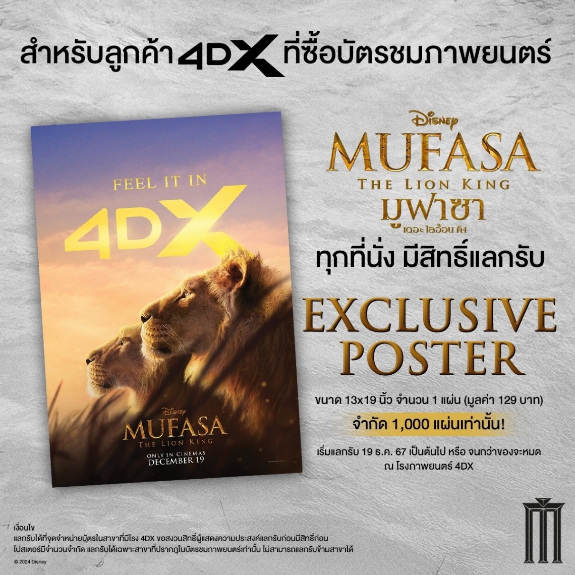 • ซื้อตั๋วชมภาพยนตร์ “Mufasa The Lion King” เฉพาะระบบ 4DX ทุก 1 ที่นั่ง สามารถแลกรับ 4DX Exclusive Poster ได้ฟรี จำนวน 1 แผ่น