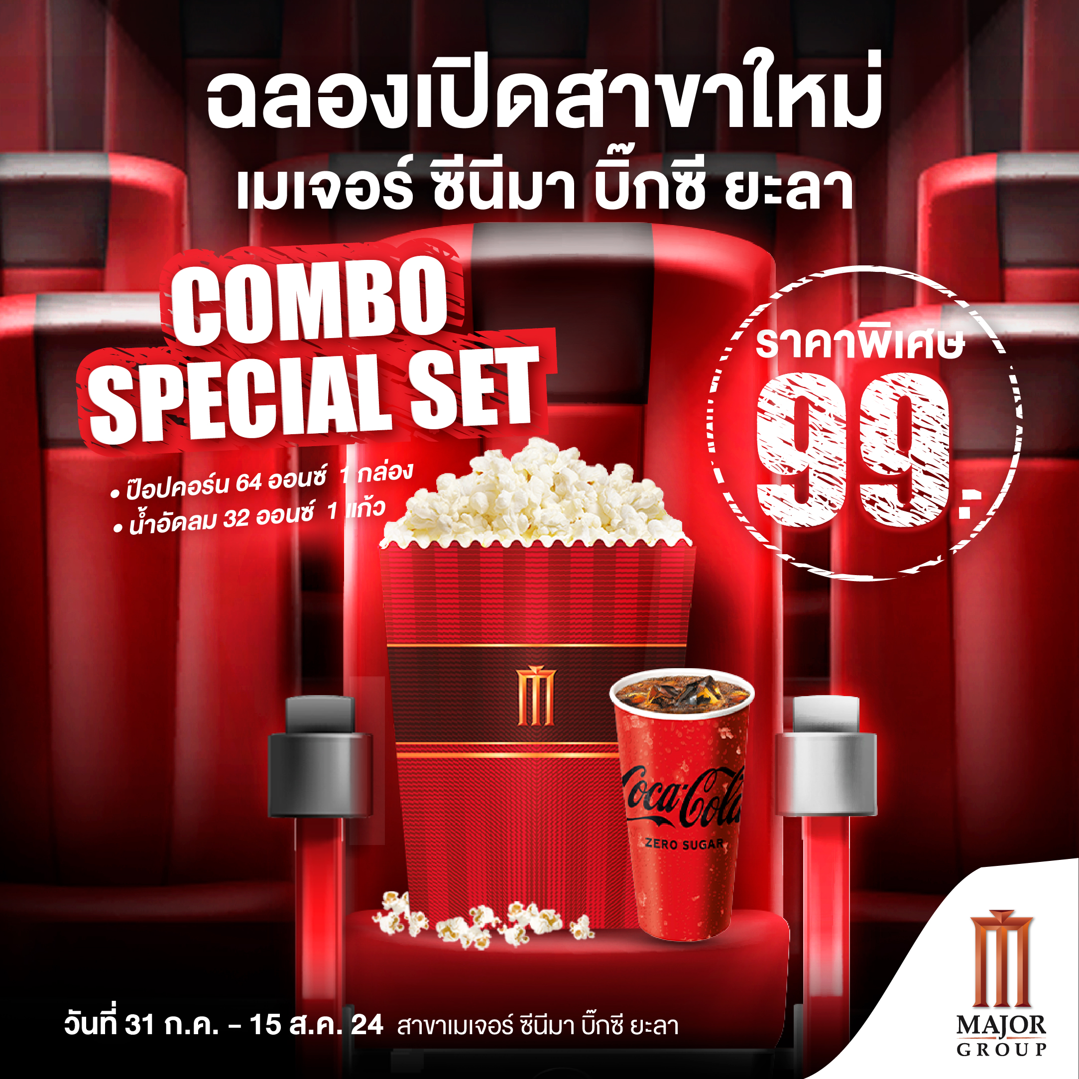สุดพิเศษ ครั้งแรกกับป๊อปคอร์นเมเจอร์และโค้ก ร่วมฉลองเปิดสาขาใหม่ เมเจอร์ ซีนีมา บิ๊กซี ยะลา จำเสิร์ฟป๊อปคอร์นอร่อยๆ เพียงชุดละ 99 บาท รับทัน! ป๊อปคอร์น 1 กล่อง (64 ออนซ์) / น้ำอัดลม จำนวน 1 แก้ว (32 ออนซ์)