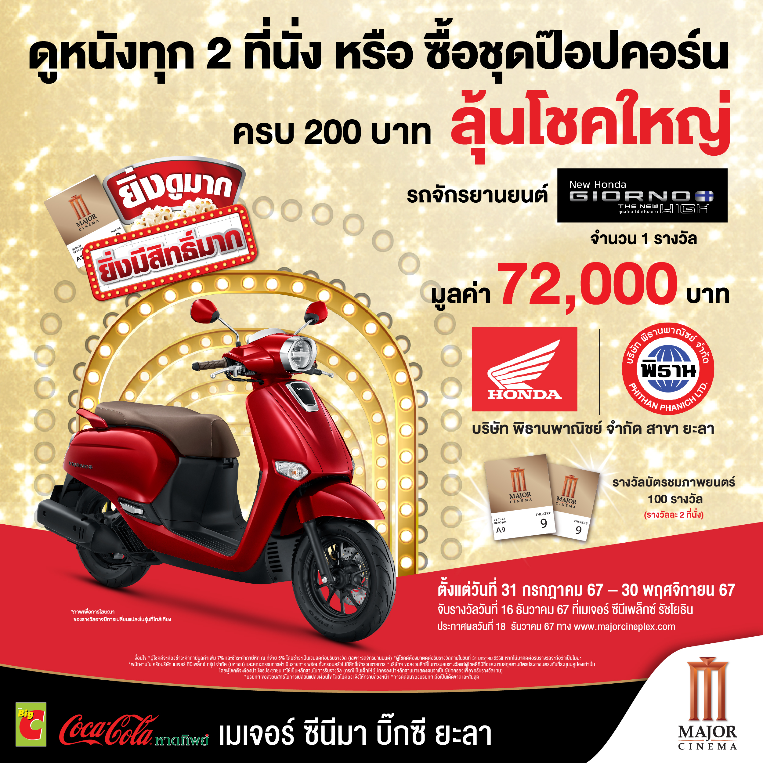 ยิ่งดูมากยิ่งมีสิทธิ์มาก เพียงดูหนังทุก 2 ที่นั่ง หรือซื้อชุดป๊อปคอร์นครบ 200 บาท ลุ้นโชคใหญ่ รถจักรยานต์ HONDA GIORNO มูลค่า 72,000 บาท สนับสนุนของรางวัลโดย บริษัท พิธานพาณิชย์ จำกัด สาขา ยะลา และรางวัลบัตรชมภาพยนตร์ 100 รางวัล รางวัล 2 ใบ ตั้งแต่วันที่ 31 กรกฎาคม – 30 พฤศจิกายน 2567 ที่ เมเจอร์ ซีนีมา บิ๊กซี ยะลา