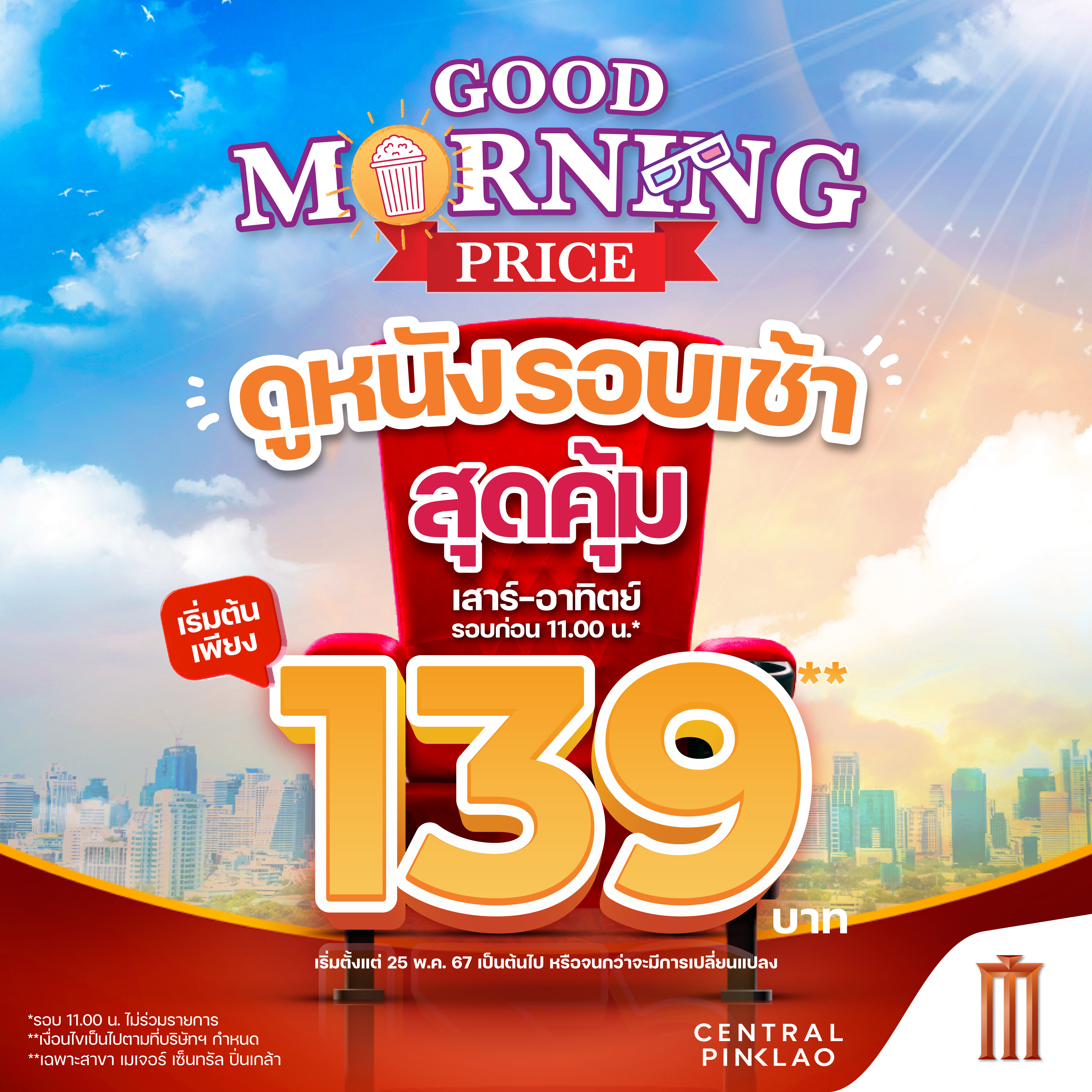 มอนิ่ง มอใจ ดูหนังสุดคุ้มสำหรับวันหยุด ทุก เสาร์-อาทิตย์ ก่อน 11.00 โมง ดูหนังเริ่มต้นเพียง 139 บาท ที่เมเจอร์ ซีนีเพล็กซ์ เซ็นทรัล ปิ่นเกล้า เท่านั้น