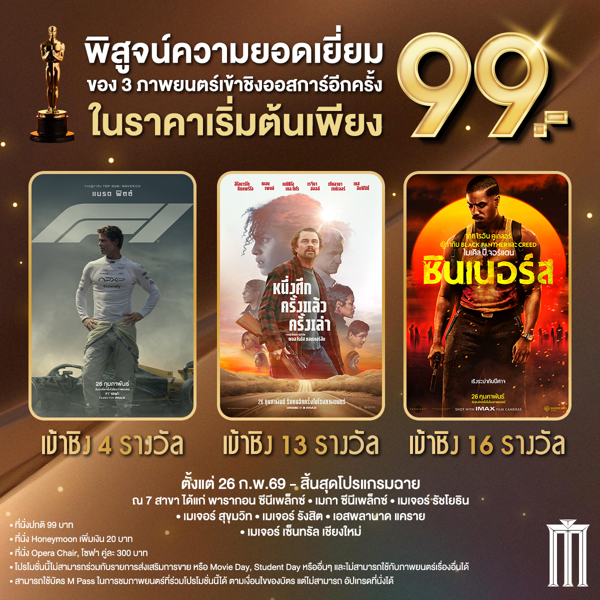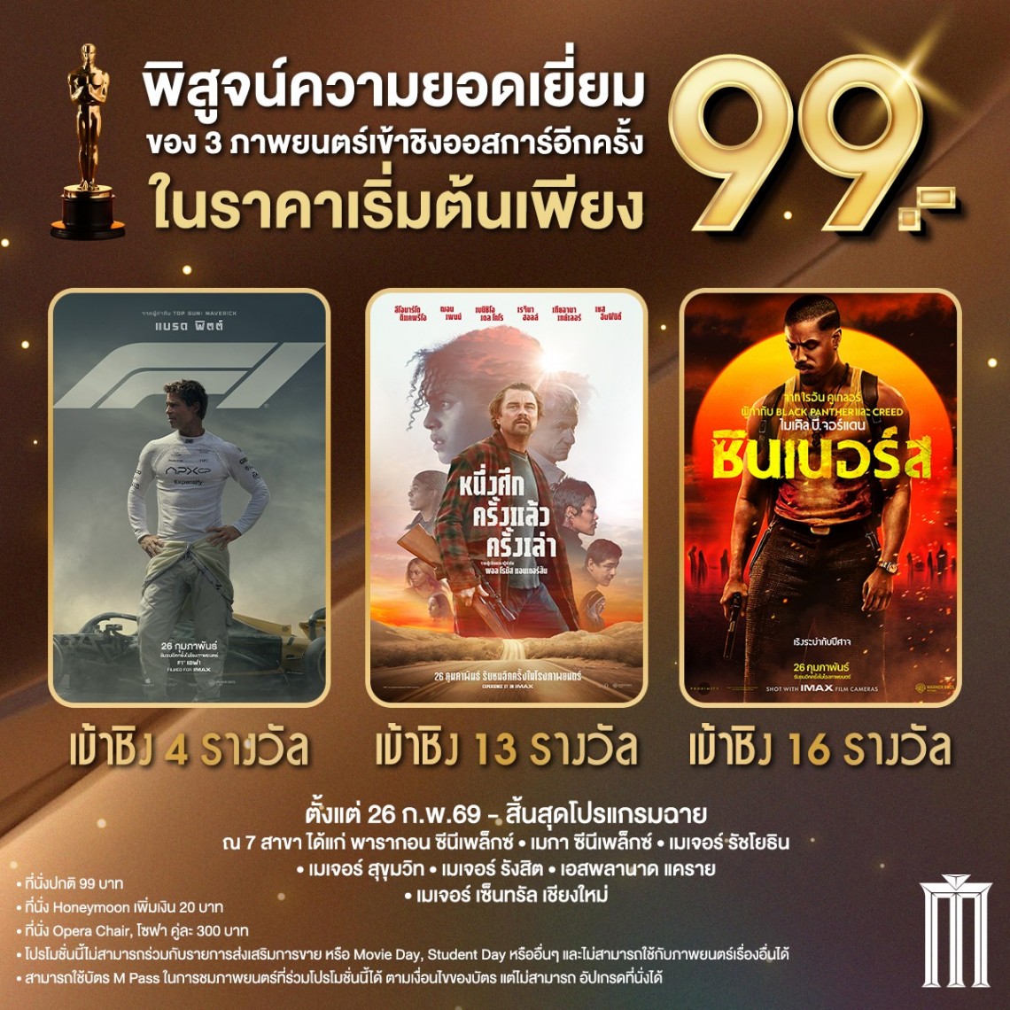 โปรโมชั่นหนัง 3 เรื่องเข้าชิงออสการ์ราคา 99 บาท (F1 The Movie, Sinners, One Battle After Another) เริ่ม 26 ก.พ. 69 – หมดโปรแกรมฉาย ณ 7 สาขาที่ร่วมรายการ