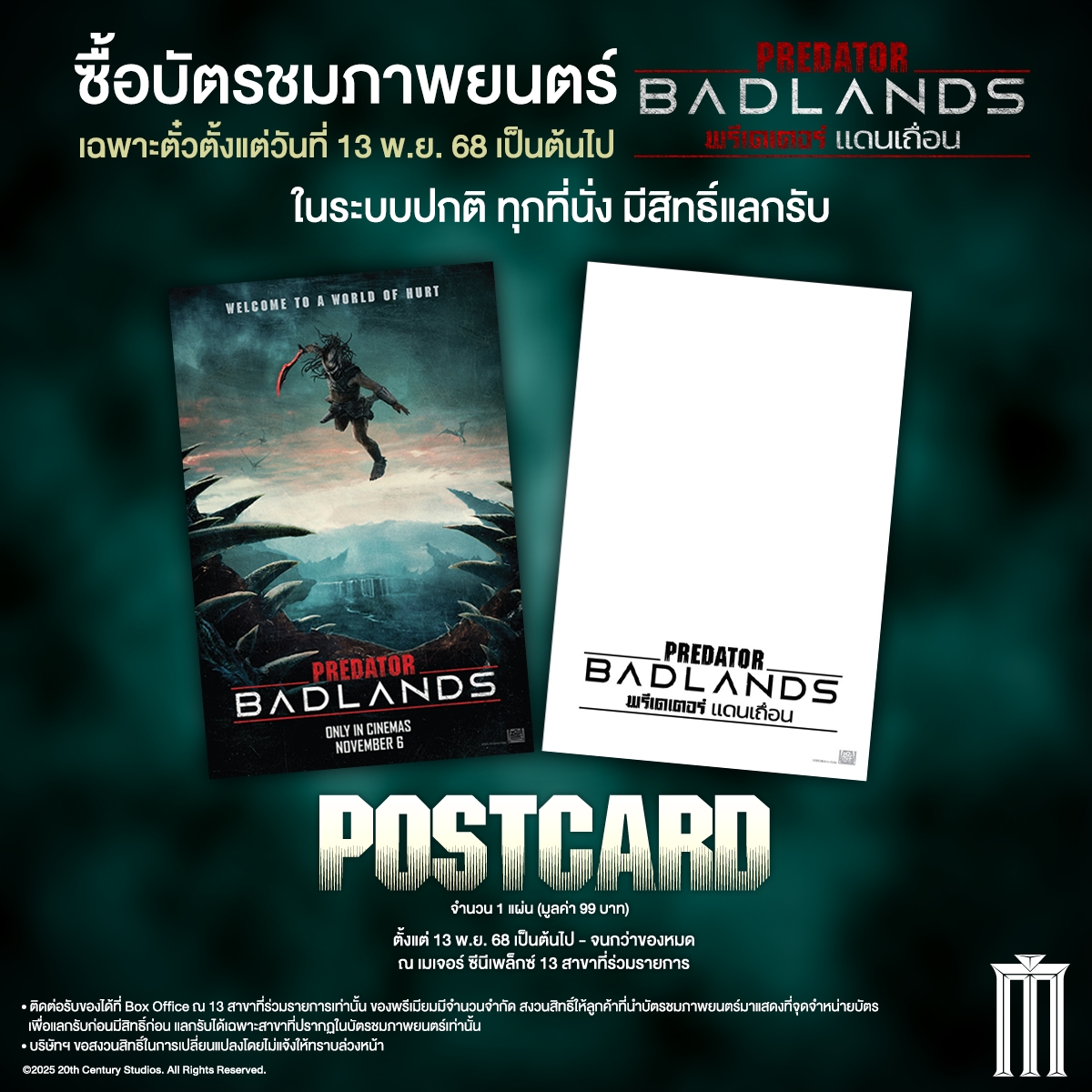 • สำหรับบัตรชมภาพยนตร์ Predator: Badlands ระบบปกติทุก 1 ที่นั่ง แลกรับ Postcard 1 ใบ โดยจะต้องเป็นตั๋วรอบวันที่ 13 พ.ย. 68 เป็นต้นไปเท่านั้น