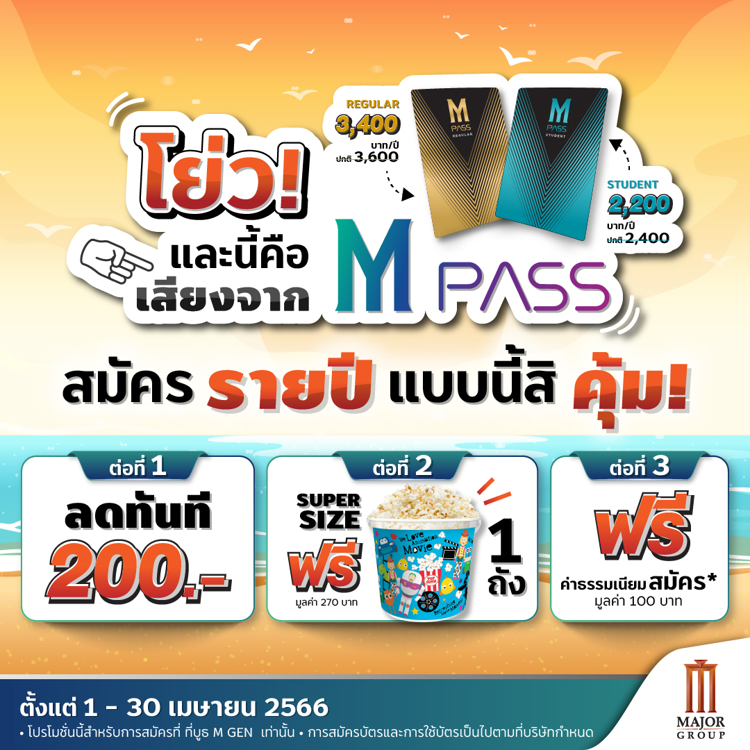 • รับ ป๊อปคอร์น Super Size ขนาด 355 ออนซ์ 1 ถัง เพียงแสดงบัตร M PASS ที่จุดจำหน่ายป๊อบคอร์น สามารถรับสิทธิ์ได้ถึง 30 เมษายน 66