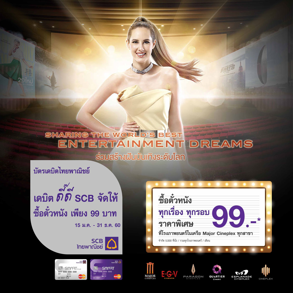 ● สิทธิพิเศษสำหรับผู้ถือบัตร เดบิตไทยพาณิชย์ทุกประเภท (ขึ้นต้นด้วยหมายเลข 5577 XXXX XXXX XXXX) รับสิทธิ์ซื้อบัตรชมภาพยนตร์ ณ เคาน์เตอร์ Box Office โรงภาพยนตร์เท่านั้น