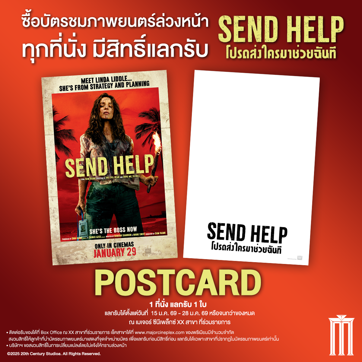 • สำหรับบัตรชมภาพยนตร์ Send Help (โปรดส่งใครมาช่วยฉันที) ทุก 1 ที่นั่ง แลกรับโปสการ์ด 1 ใบ