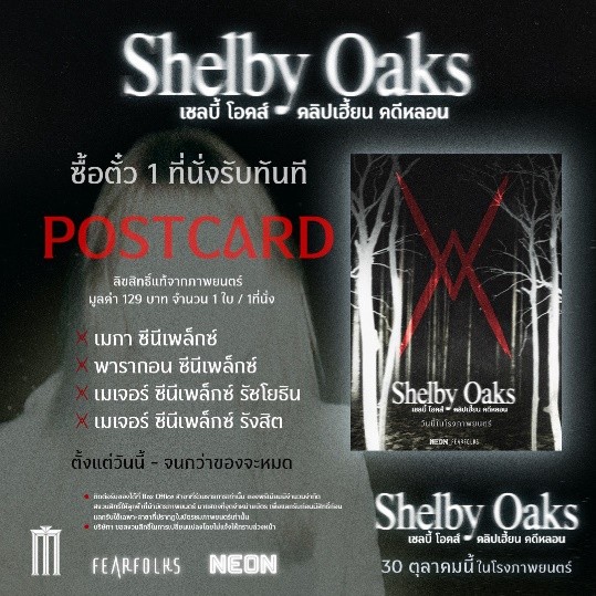 1. สำหรับบัตรชมภาพยนตร์ Shelby Oaks ทุก 1 ที่นั่ง แลกรับ Postcard 1 ใบ