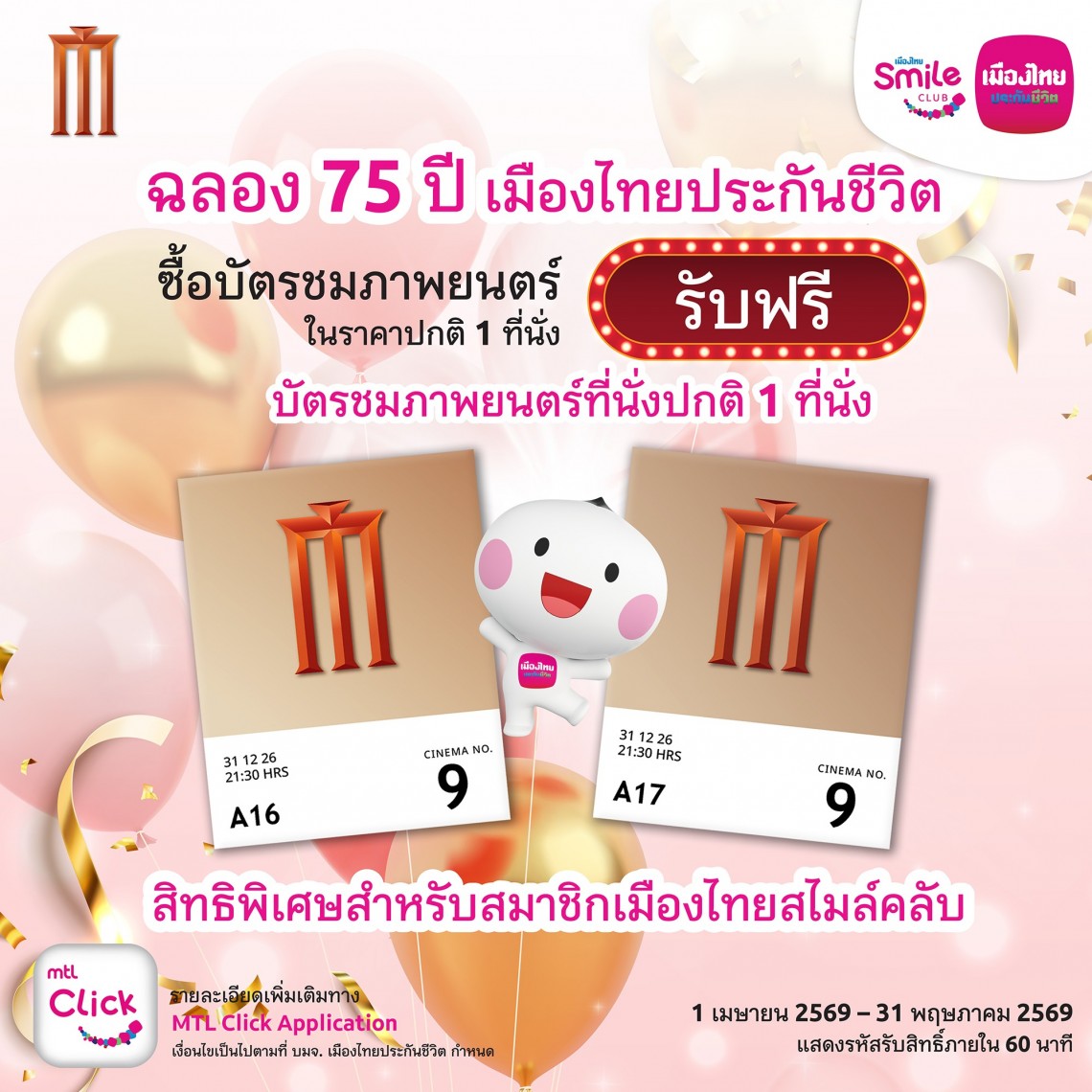 เมืองไทยสไมล์คลับ ฉลอง 75 ปี ซื้อตั๋วหนัง 1 ฟรี 1