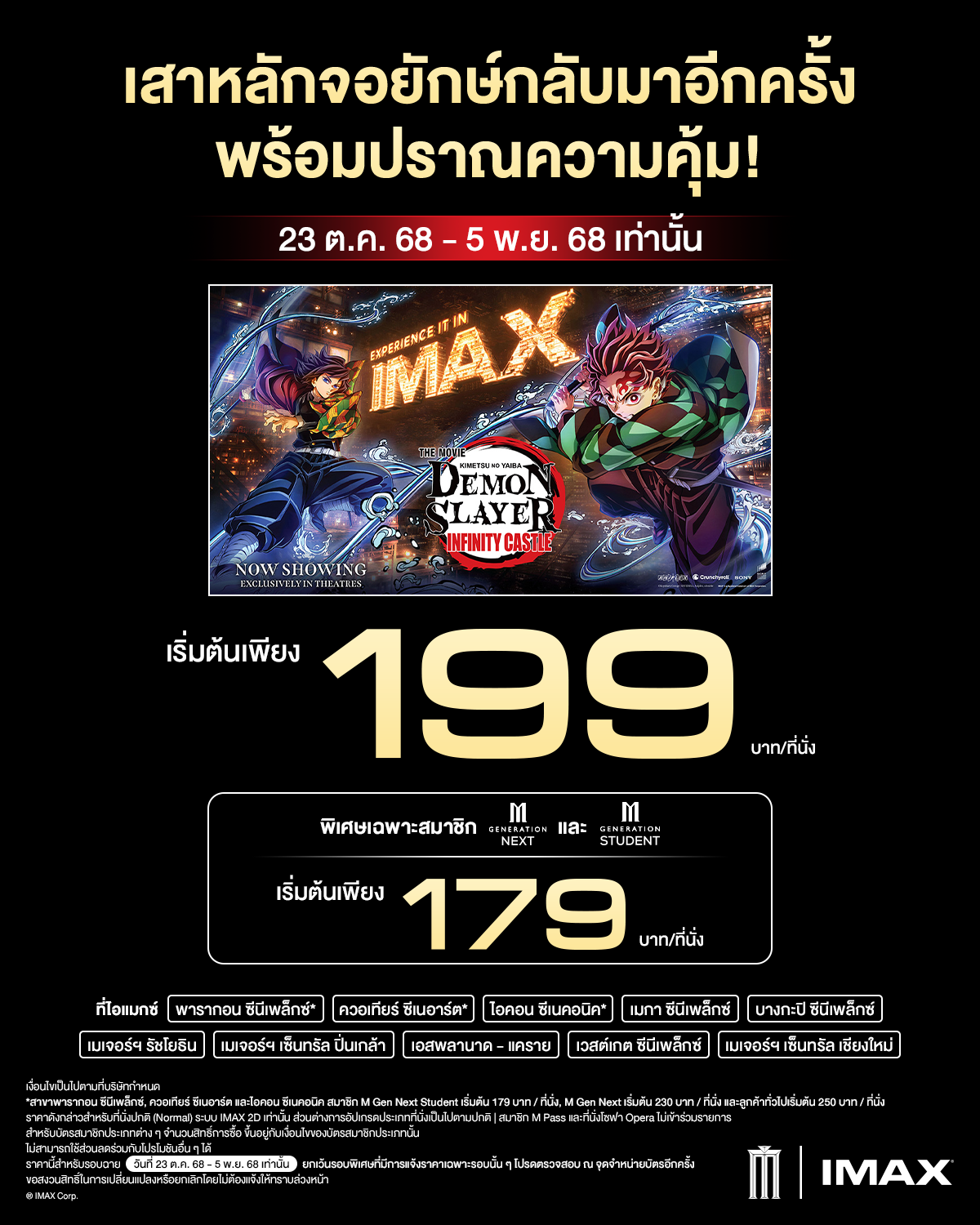 1. สำหรับสมาชิก M Gen Next Student ที่นั่งปกติ (Normal) ระบบ IMAX 2D เริ่มต้น 179 บาทต่อที่นั่ง