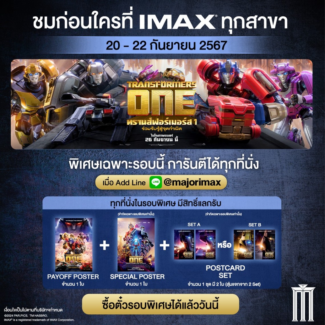 1. สำหรับลูกค้าที่ซื้อตั๋วชมภาพยนตร์ระบบ IMAX with Laser และ IMAX เรื่อง Transformers One วันที่ 20 – 22 กันยายน 2567 พร้อมเพิ่มเพื่อน Line OA @majorimax มีสิทธิ์แลกรับ