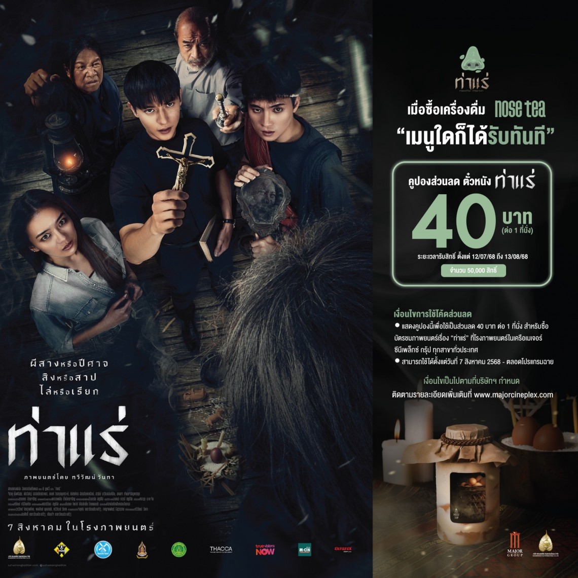 • ซื้อเครื่องดื่มใดก็ได้ ที่ร้าน Nose Tea มีสิทธิ์รับโค้ดส่วนลดมูลค่า 40 บาท/ที่นั่ง สำหรับซื้อภาพยนตร์เรื่อง ท่าแร่ จำนวน 1 สิทธิ์ ต่อ 1 ที่นั่ง