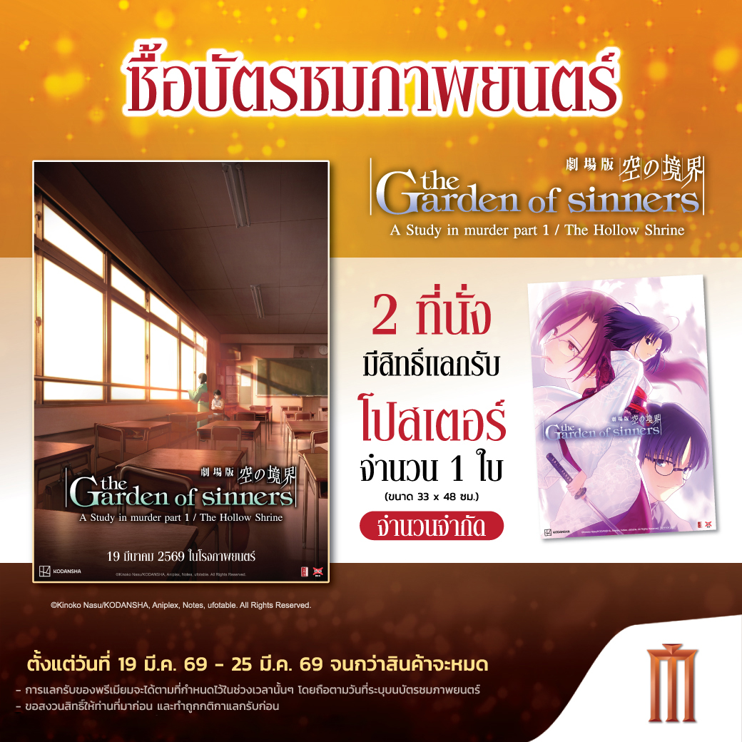 • ซื้อบัตรชมภาพยนตร์ THE GARDEN OF SINNERS ทุก 2 ที่นั่ง มีสิทธิ์รับ โปสเตอร์ จำนวน 1 ใบ