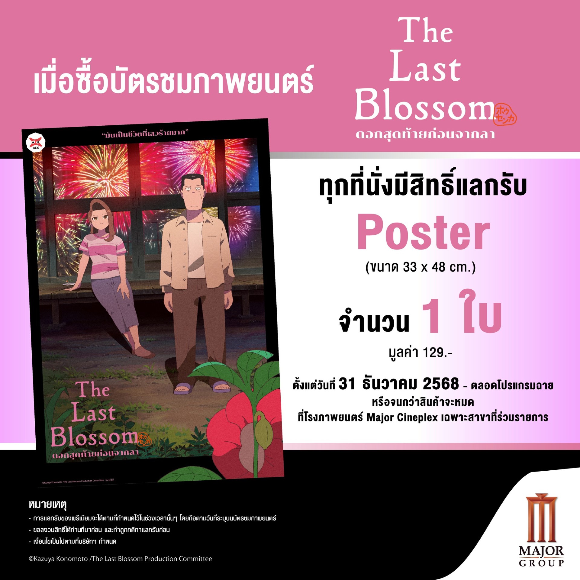 • ซื้อบัตรชมภาพยนตร์เรื่อง The Last Blossom ทุกที่นั่ง มีสิทธิ์รับ โปสเตอร์ ขนาด 33 x 48 cm จำนวน 1 ใบ (มูลค่า 129 บาท)