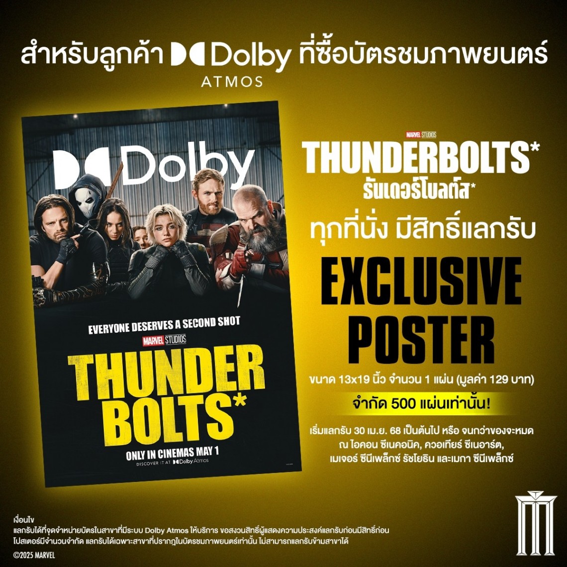 • ซื้อตั๋วชมภาพยนตร์ “Thunderbolt*” เฉพาะระบบ Dolby Atmos ทุก 1 ที่นั่ง สามารถแลกรับ Dolby Atmos Exclusive Poster ได้ฟรี จำนวน 1 แผ่น
