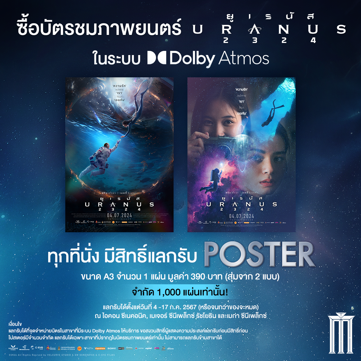 • ซื้อบัตรชมภาพยนตร์ เรื่อง “ยูเรนัส2324” ในระบบ Dolby Atmos ทุกที่นั่ง แลกรับ “โปสเตอร์” จำนวน 1 แผ่น