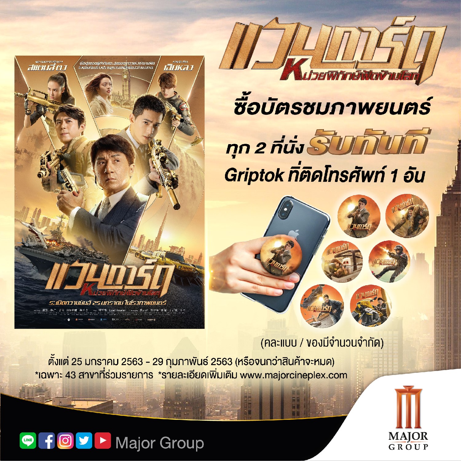 ซื้อบัตรชมภาพยนตร์ แวนการ์ด หน่วยพิทักษ์ฟัดข้ามโลก ทุก 2 ที่นั่ง รับฟรี Griptok ที่ติดโทรศัพท์ 1 อัน มูลค่า 129 บาท ตั้งแต่ 25 มกราคม 2563 – 29 กุมภาพันธ์ 2563 (หรือจนกว่าสินค้าจะหมด) เฉพาะ 43 สาขาที่ร่วมรายการ*