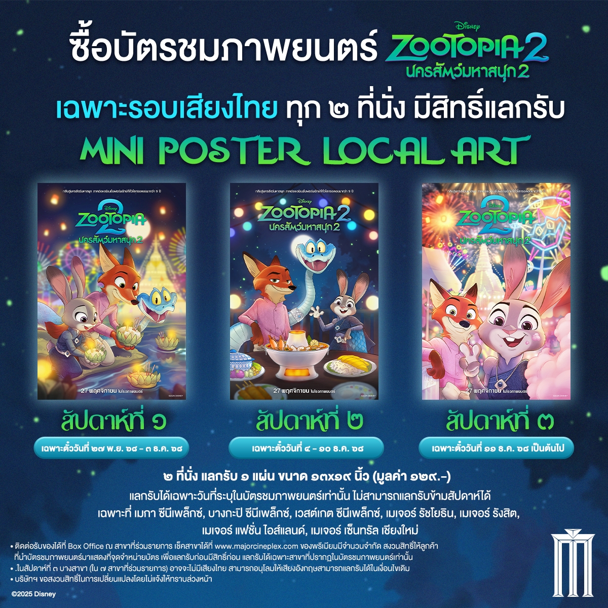 • สำหรับบัตรชมภาพยนตร์ Zootopia 2 ระบบเสียงไทย ทุก 2 ที่นั่ง จะได้รับโปสเตอร์ “Zootopia 2 Local Art” 1 ใบตามลายแต่ละสัปดาห์ ณ 7 สาขาที่ร่วมรายการ